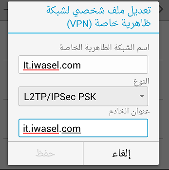 اسم الشبكة الظاهرية الخاصة: عنوان خادم آي واصل الذي تفضله مثلا (it.iwasel.com).